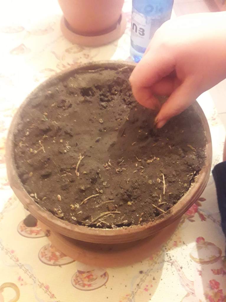 Ընկեր Շուշանը ամեն մեկին տվեց տարբեր կանաչինների սերմեր:Ինձ տվեց սամիթի սերմ ես բերեցի սամիթի սերմը իմ տուն և սկսեցի աշխատել:Սկզբում ես ծաղիկի տարա բերեցի տարայի մեջ հող լցրեցի հետո վերցրեցի սամիթի սերմը և լցրեցի հողով տարայի մեջ:Հետո ես նորից հող լցրեցի սերմերի վրա և ջուր լցրեցի սերմերի վրա:Հետո ես մատերով մցրեցի հողի մեջ և ցելաֆոնով փակեցի: