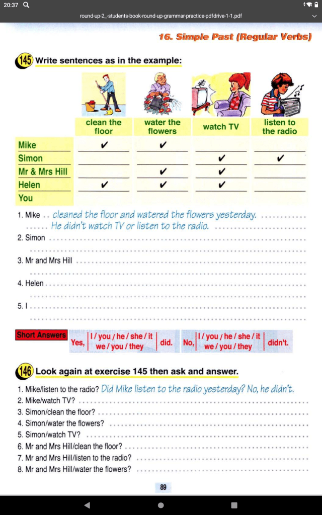 Mr and mrs Hill watered the flowers and watched TV.They didn’t clean the floor or listen to the radio.