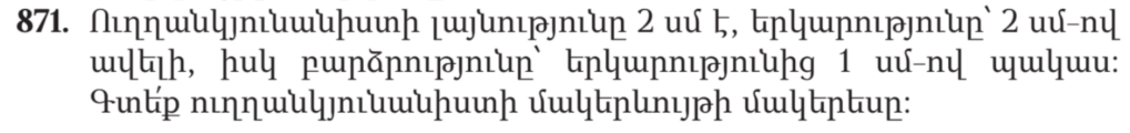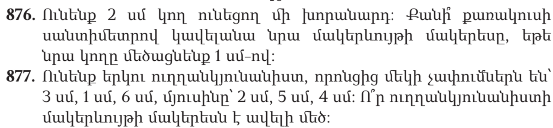 Posted in Մաթեմատիկա 6 Ուղղանկյունանիստի մակերևույթը և նրա մակերեսը Posted on March 6, 2023March 6, 2023 by davitharutyunyan2012 52 սմ 876. 30 սմ 877. Երկրորդի 12 սմ 36 Share this: Click to share on X (Opens in new window) X Click to share on Facebook (Opens in new window) Facebook Like Loading... Author: davitharutyunyan2012 View All Posts