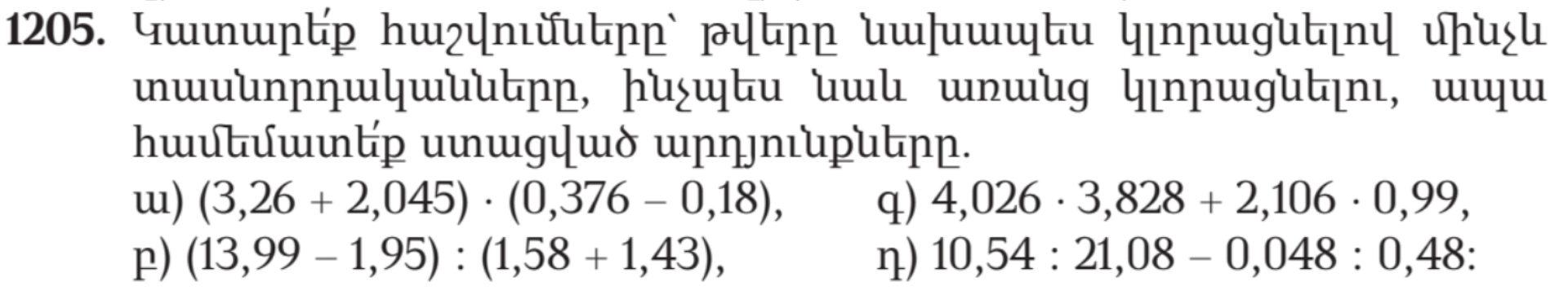 Ա) (3,2 + 2,0) × (0,3 – 0,1)= 1,4 բ) (13,9 – 1,9) : (1,5 +1,4)= 6,1 գ) 4,0 × 3,8 + 2,1 × 0,9 = 9,2 + 18,2 = 27,4 դ) 10,5 : 21,0 – 0,1 : 0,4 = 2,5 – 0,4 = 2,9