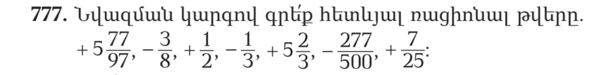 + 5 77/97, + 5 2/3, + 1/2, +7/25, – 1/3, – 2/8, – 277/500